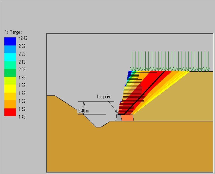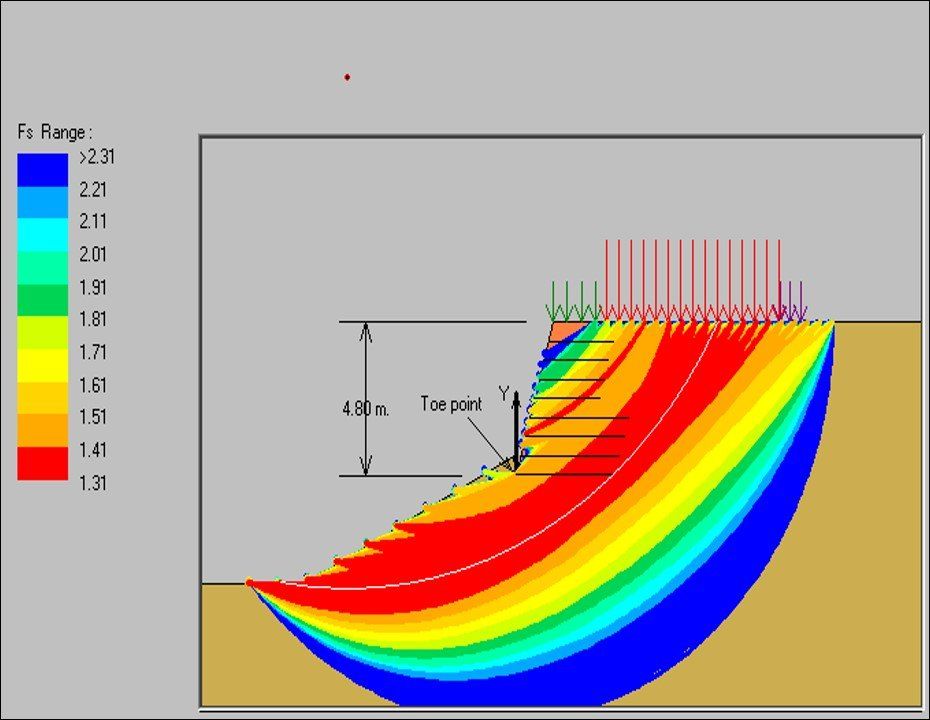 | i < 70° | RSS – Pendio Rinforzato (Reinforced Soil Slope) | • Scorrimento diretto su ogni rinforzo e sulla fondazione (Spencer (1) e Jambu (1)): (C + B) • Scorrimento rotazionale, anche al di fuori del blocco rinforzato per verificare la stabilità globale del pendio (Bishop (1) e Fellenius (1) ): (C + B) • Capacità portante della fondazione: (B) • Compatibilità dei cedimenti rispetto al tipo di opera: (B) |